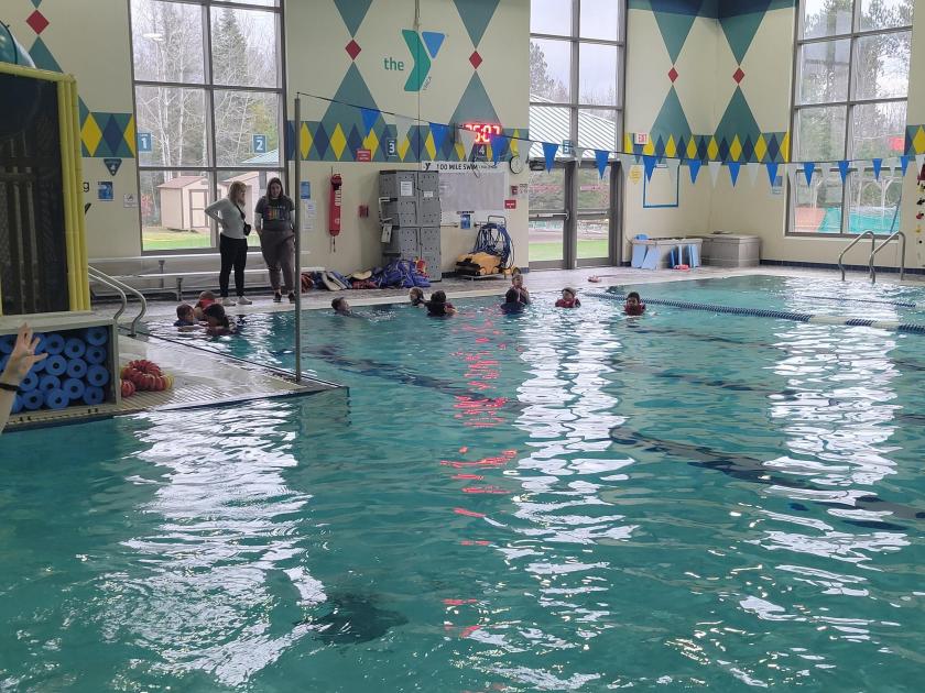 Kids participate in a swim lesson; instructors watch from the pool's edge.